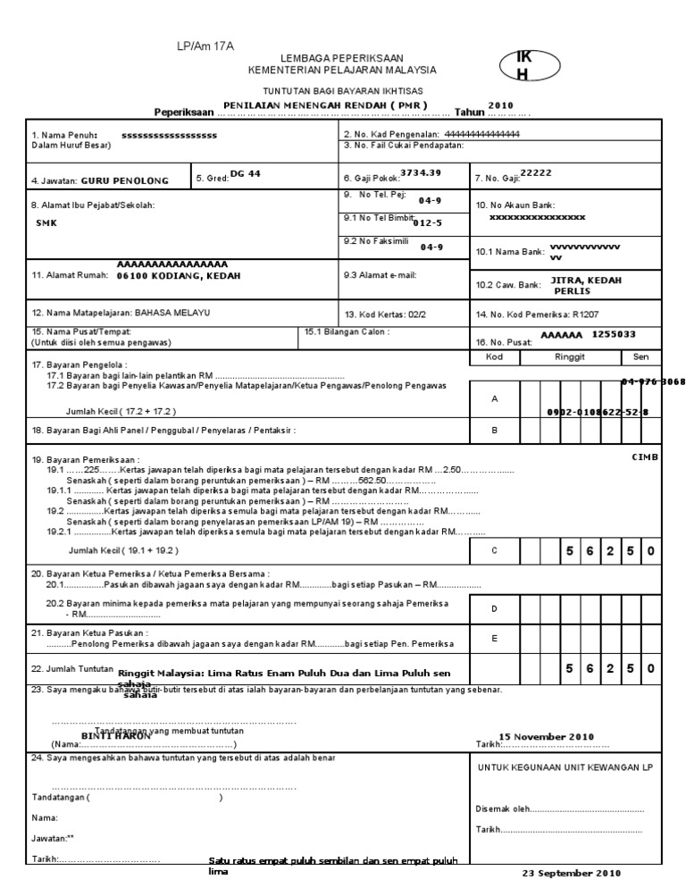 Contoh Borang Tuntutan Ikhtisas Untuk Peperiksaan Spm
